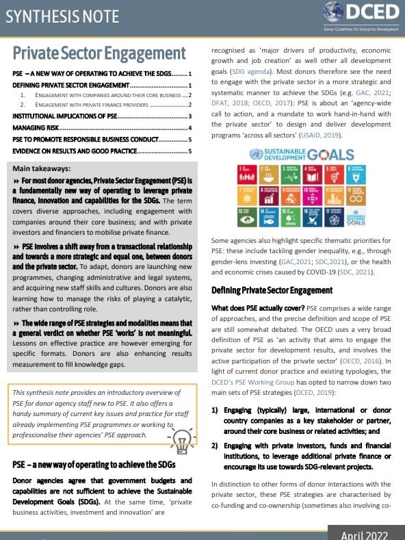 Many donors aspire to have more equal, longer-term and strategic relationships with business in achieving inclusive economic outcomes in developing countries, complementing their traditional focus on bilateral work with governments. Increasingly, donors are also asked to engage with their own domestic companies to deliver mutual benefits for donor and partner country economies