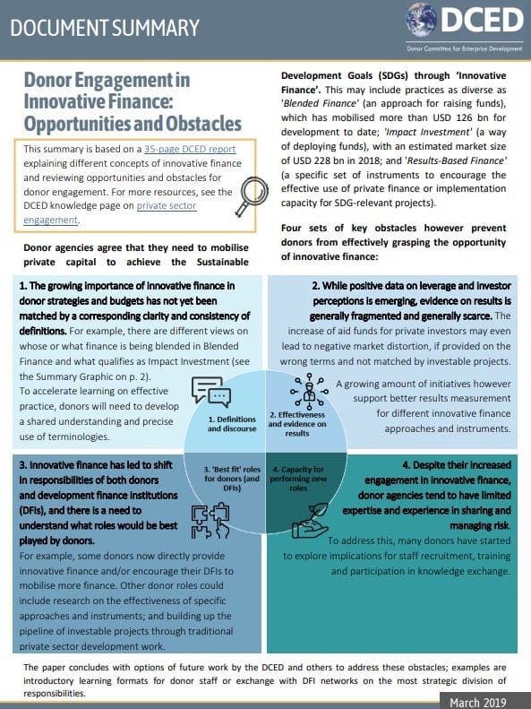 The group’s current focus is to contribute to the DCED’s learning agenda on how to achieve (and measure) mutual benefits for donor and partner countries, at the nexus of PSE, trade and other national interests. The group also continues to have a strong interest in organisational aspects and effective instruments of private sector engagement, and the interface with financial institutions – building on many years of facilitating peer exchange and learning sessions in the safe space of the group. Specifically, current activities include