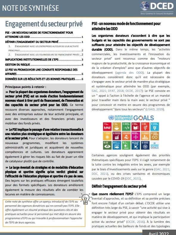 The OECD has proposed a broad definition of PSE as ‘an activity that aims to engage the private sector for development results, and involves the active participation of the private sector’ (OECD, 2016). The DCED PSE Working Group in its Operational Framework (2019) focuses on two specific PSE strategies: