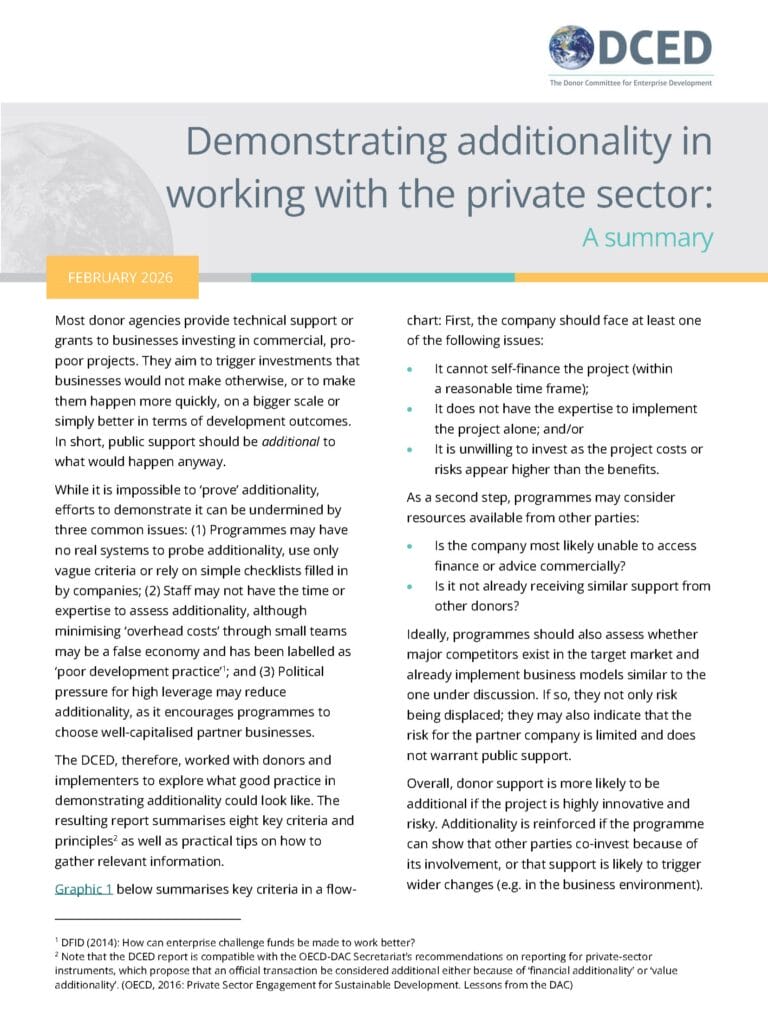 The group’s current focus is to contribute to the DCED’s learning agenda on how to achieve (and measure) mutual benefits for donor and partner countries, at the nexus of PSE, trade and other national interests. The group also continues to have a strong interest in organisational aspects and effective instruments of private sector engagement, and the interface with financial institutions – building on many years of facilitating peer exchange and learning sessions in the safe space of the group. Specifically, current activities include